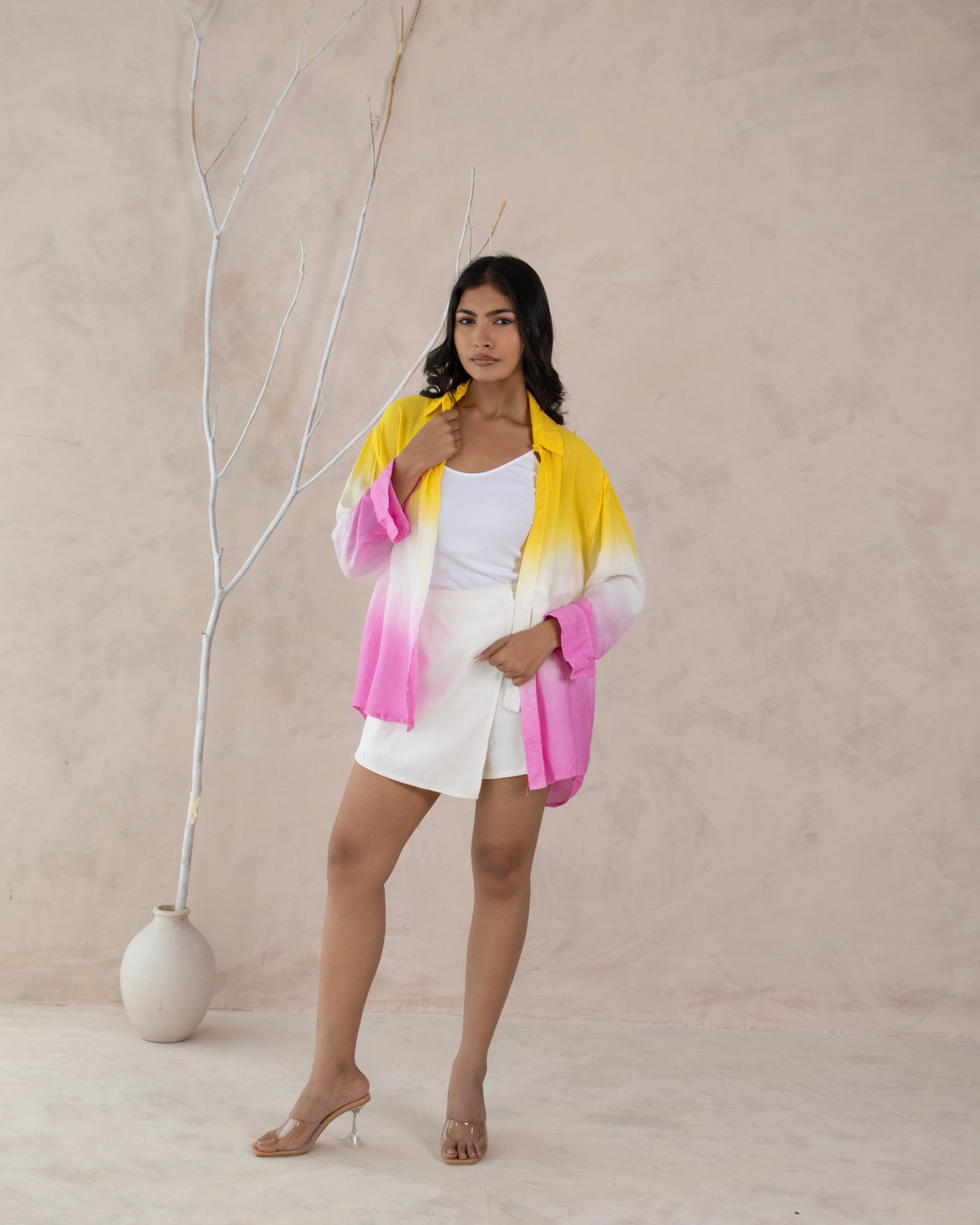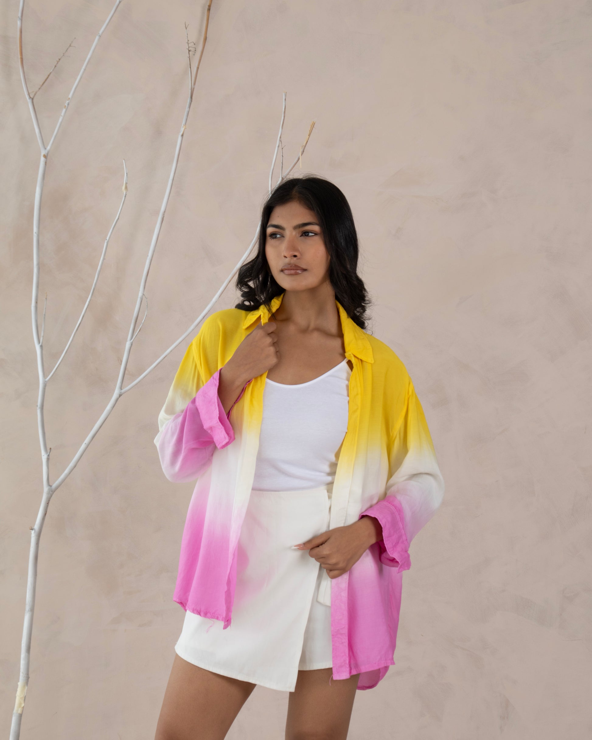 Dry Mango Yellow White Pink Ombré Cotton Shirt for Women