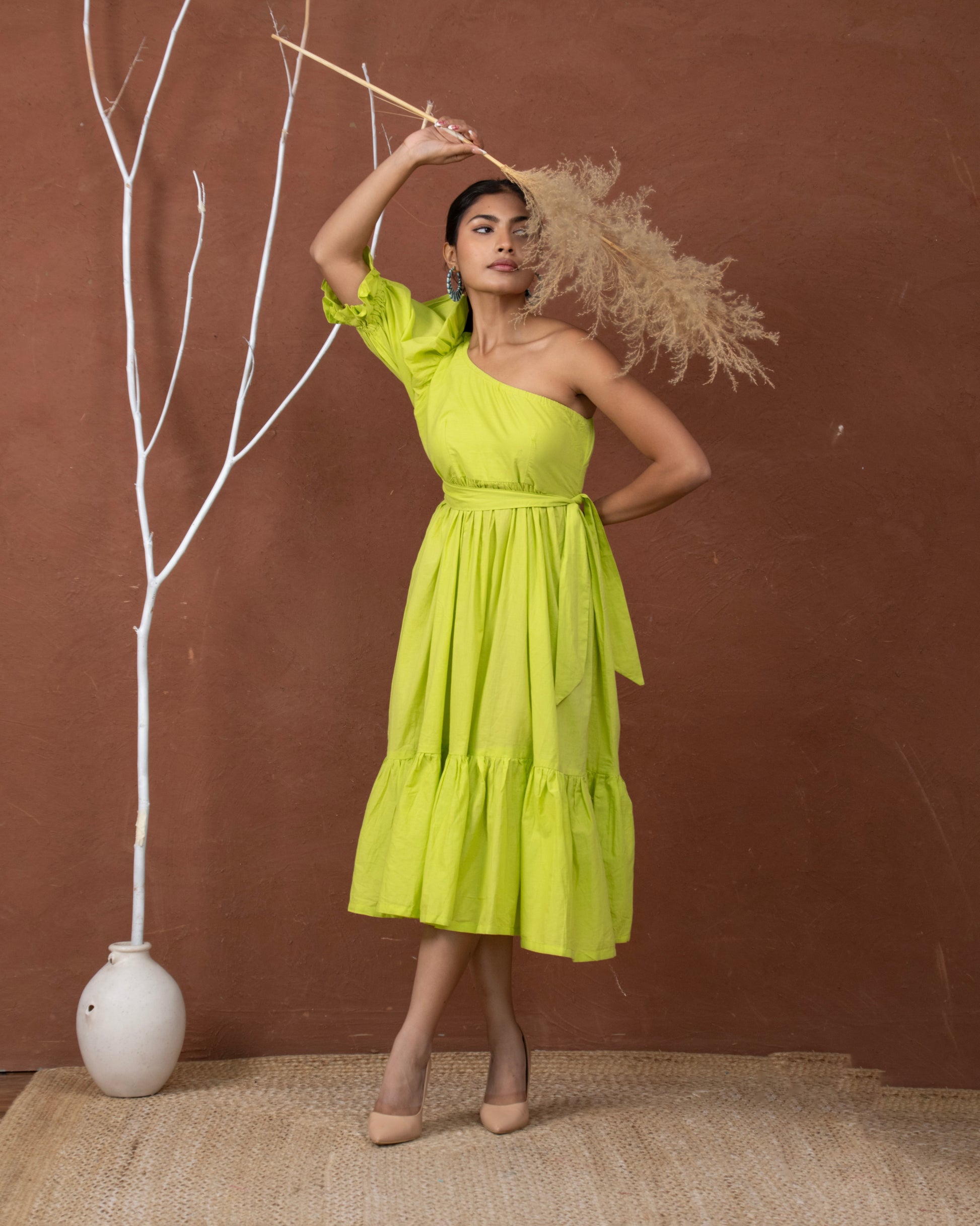 Lime Lush is a tropical dream in zesty lime green, featuring a one-shoulder silhouette with a dramatic puff sleeve and a belted waist. The tiered hem adds easy elegance, perfect for garden brunches, holiday resorts, or destination weddings. Pair it with nude flats or gold accents for sun-kissed chic.