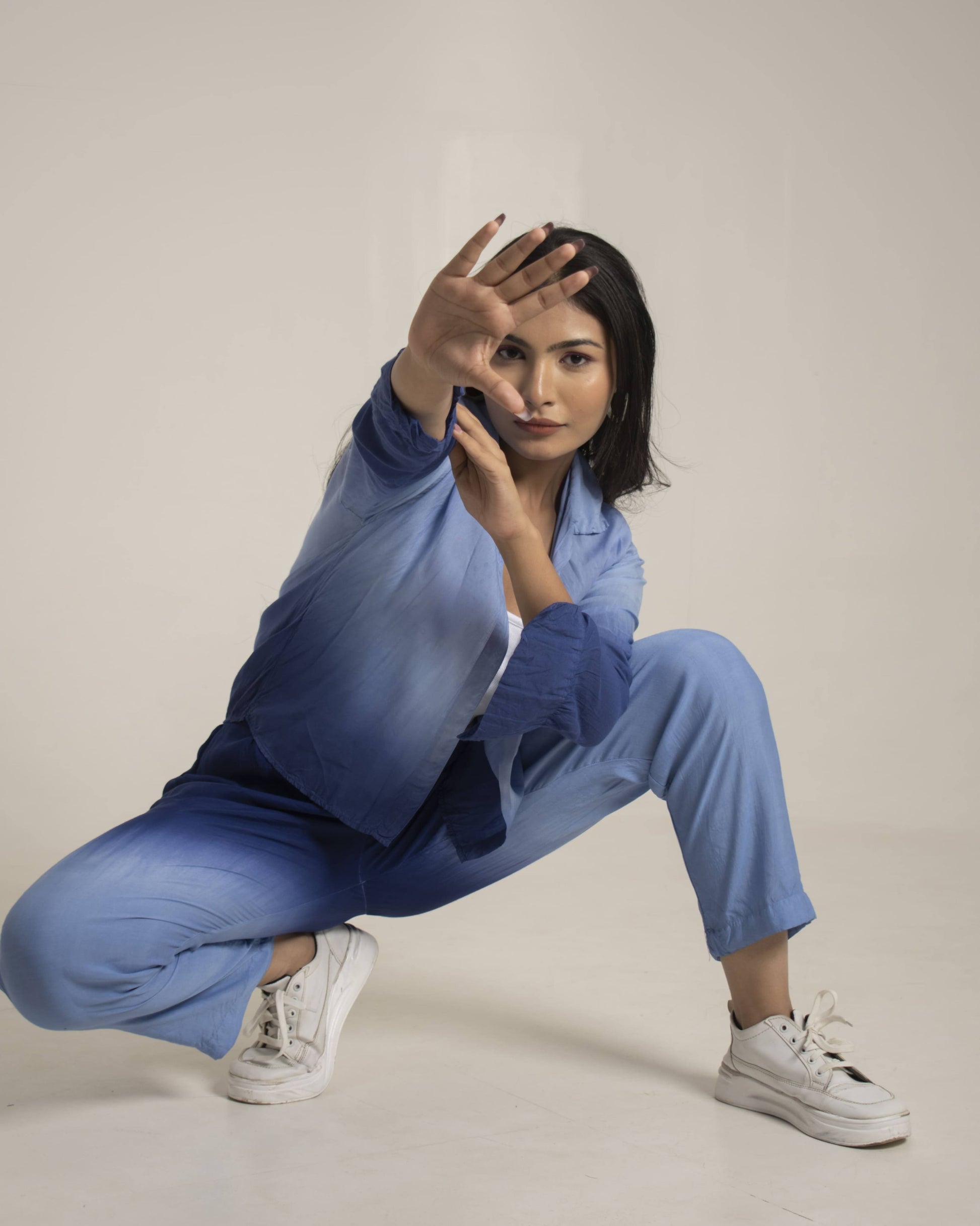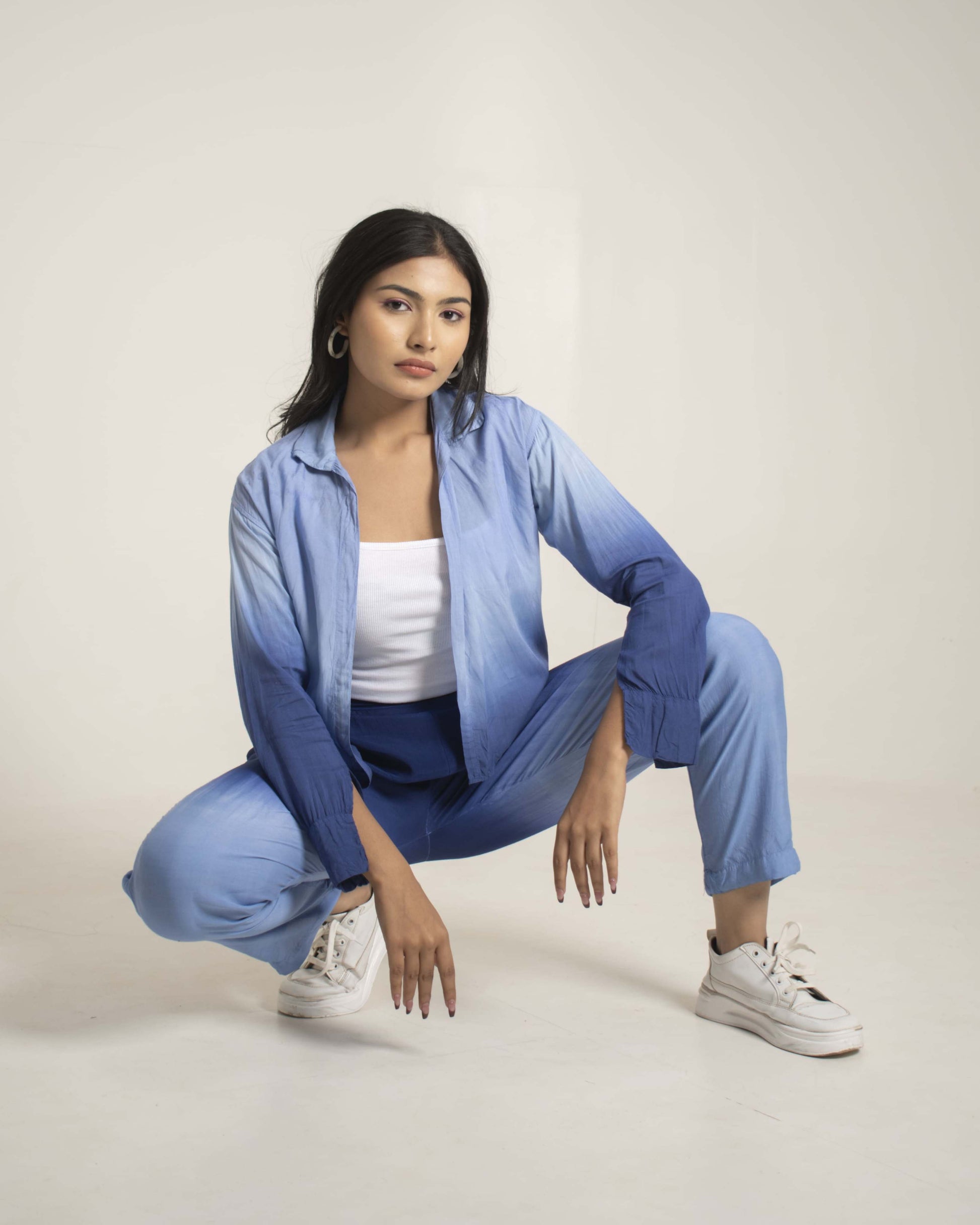 Midnight Ocean Blue Ombre Exotic Shades of Blue Full sleeves 2 piece Cotton Co-Ord Set for Women