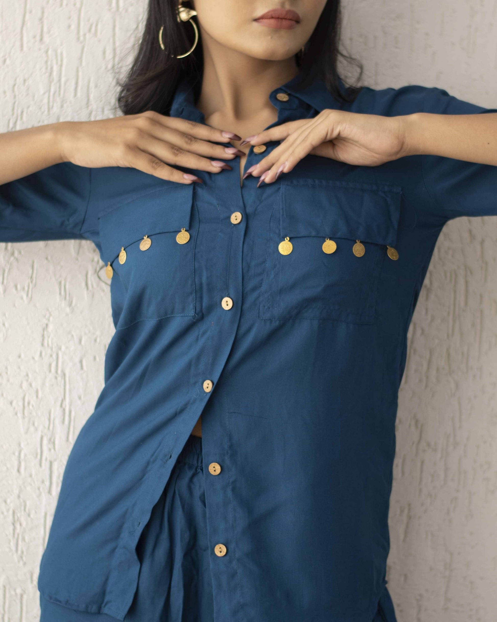 Turn heads with our navy blue co-ord set. The ensemble features a structured top with 3/4th sleeves along with straight-legged trousers, making it a versatile addition to your wardrobe.