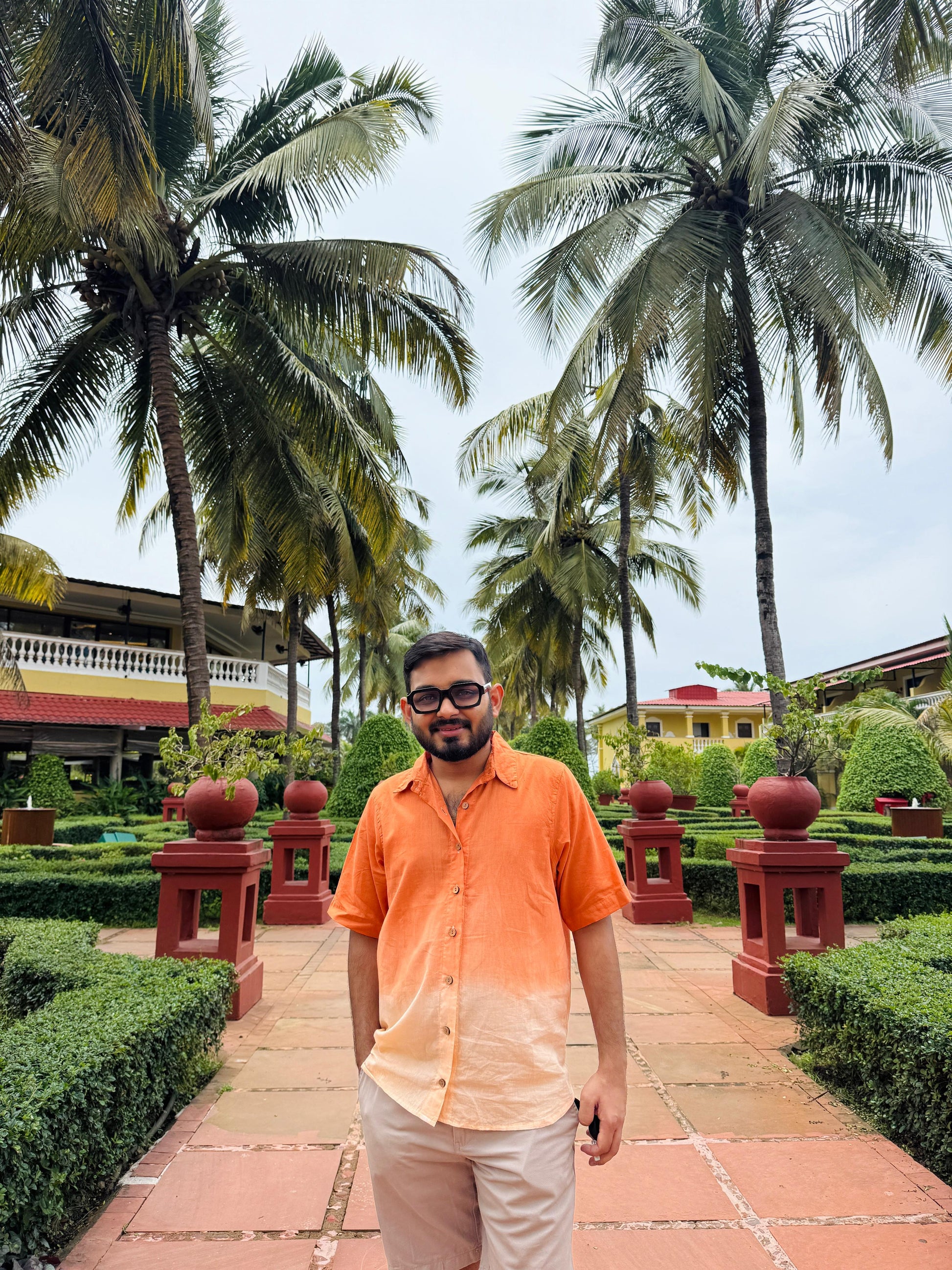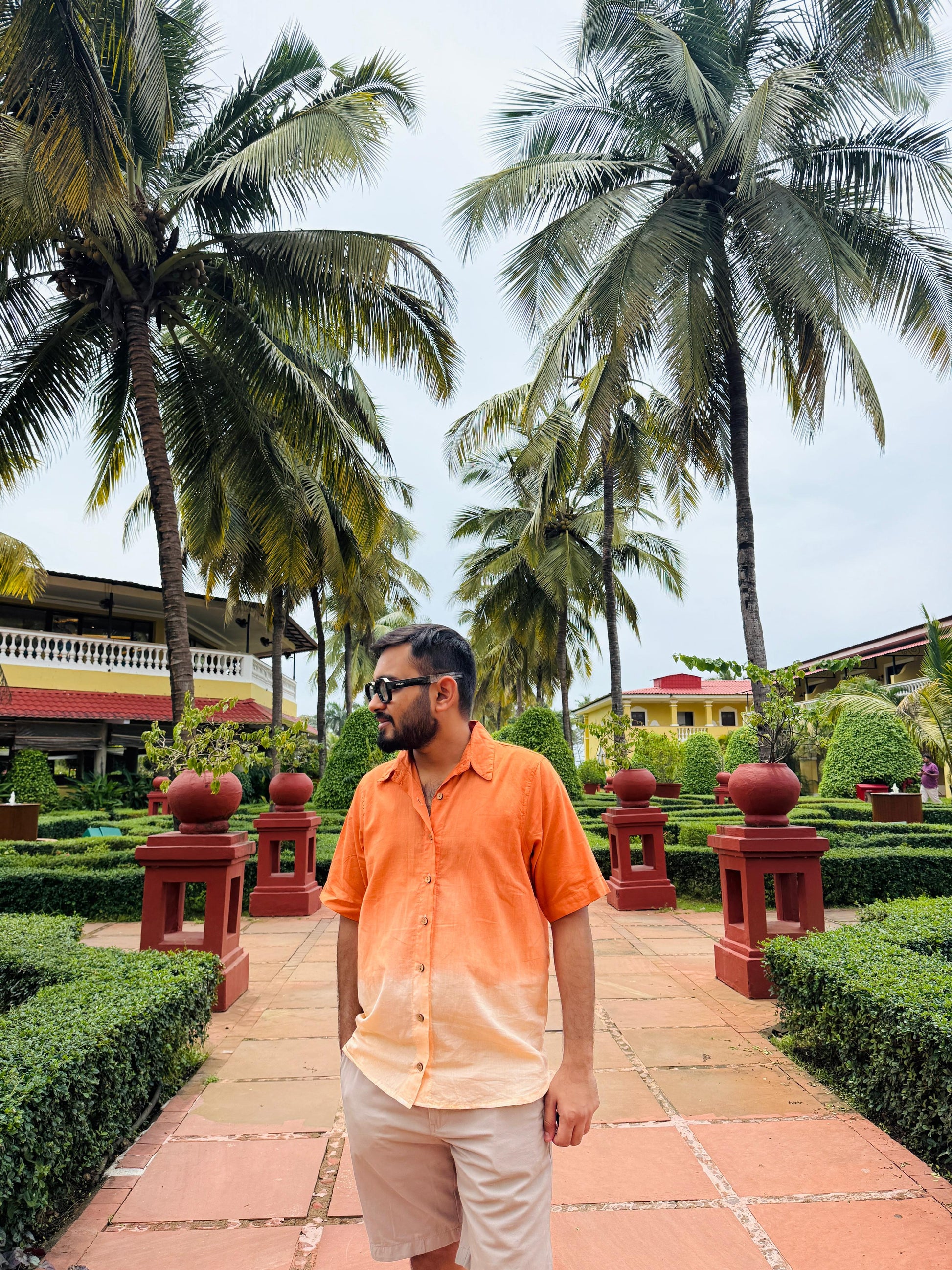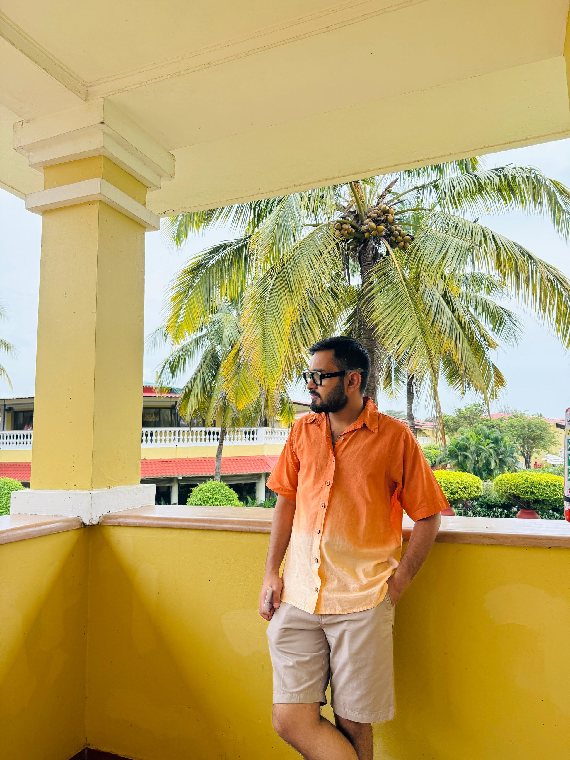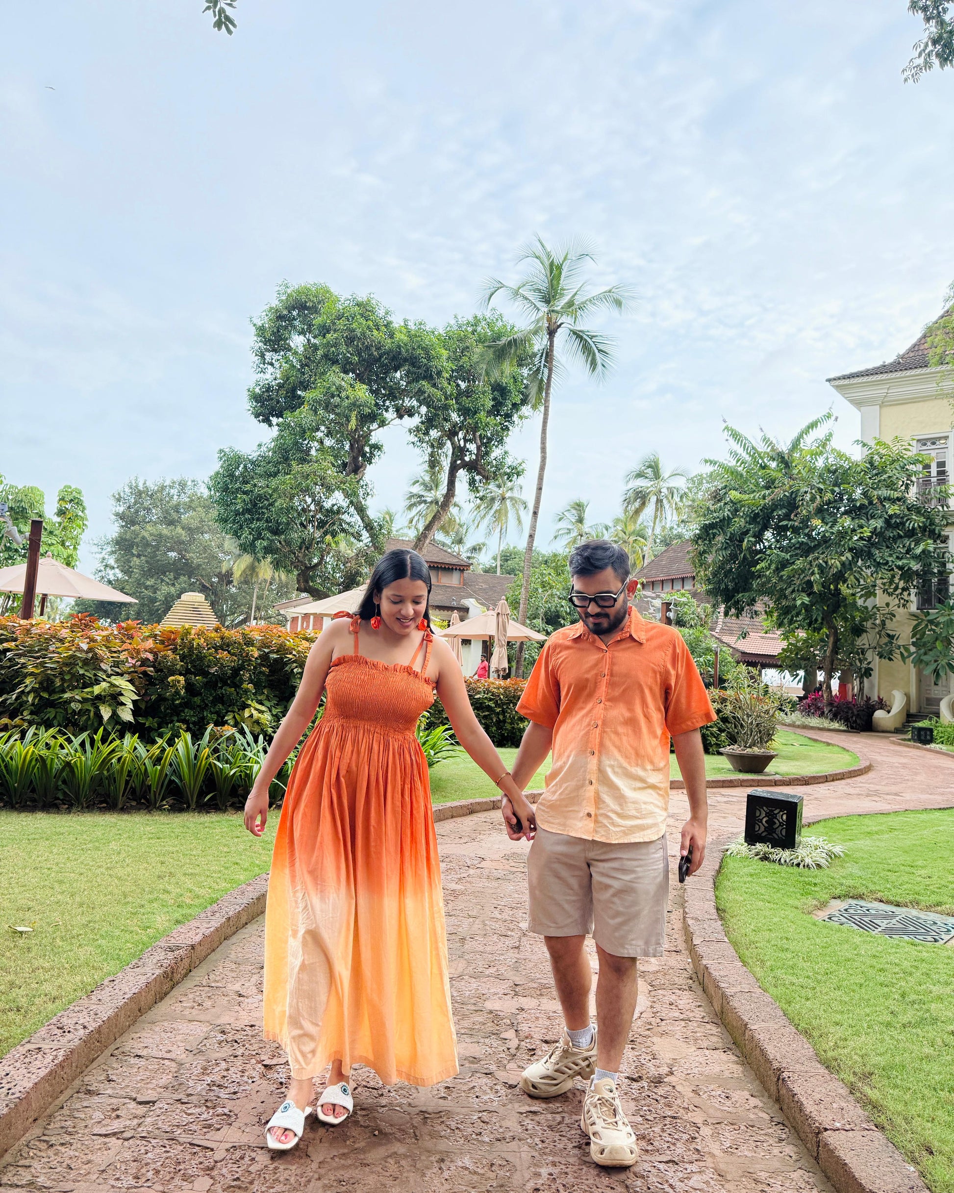 A grounded yet graceful couple outfit in warm ombré tones. The dress moves from terracotta to desert beige in flared tiers, while the men’s shirt mirrors this blend with clean lines and a relaxed fit. Crafted in soft cotton, the set brings effortless ease and harmony to sunlit days.